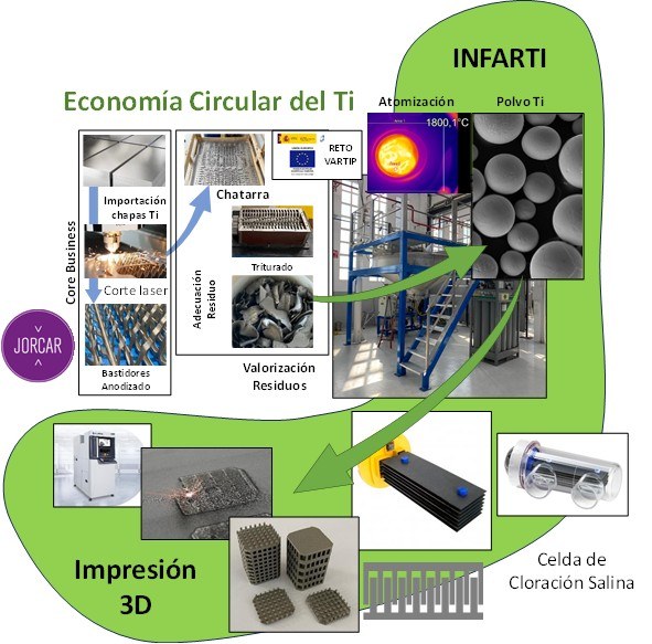 The main objective of the INFARTI project is to evaluate additive manufacturing technology as a way to valorize titanium waste. The proposal starts from the recycling of Ti sheet scrap, applying a melting and atomization process to produce powder with which, through 3D printing by selective laser melting technology (SLM), Ti electrodes for electrolytic cells can be manufactured.